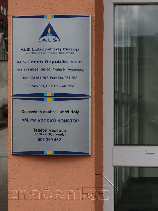 Nadnárodní společnost ALS Laboratory group se zaměřuje na environmentální problematiku, speciálně na monitoring životního prostředí a dále na analýzy potravin, krmiv, paliv a mnoha dalších produktů. Hlavní laboratoř v české republice sídlí v Praze Na Harfě. Naše společnost projektovala a realizovala orientační a informační značení v tomto objektu.